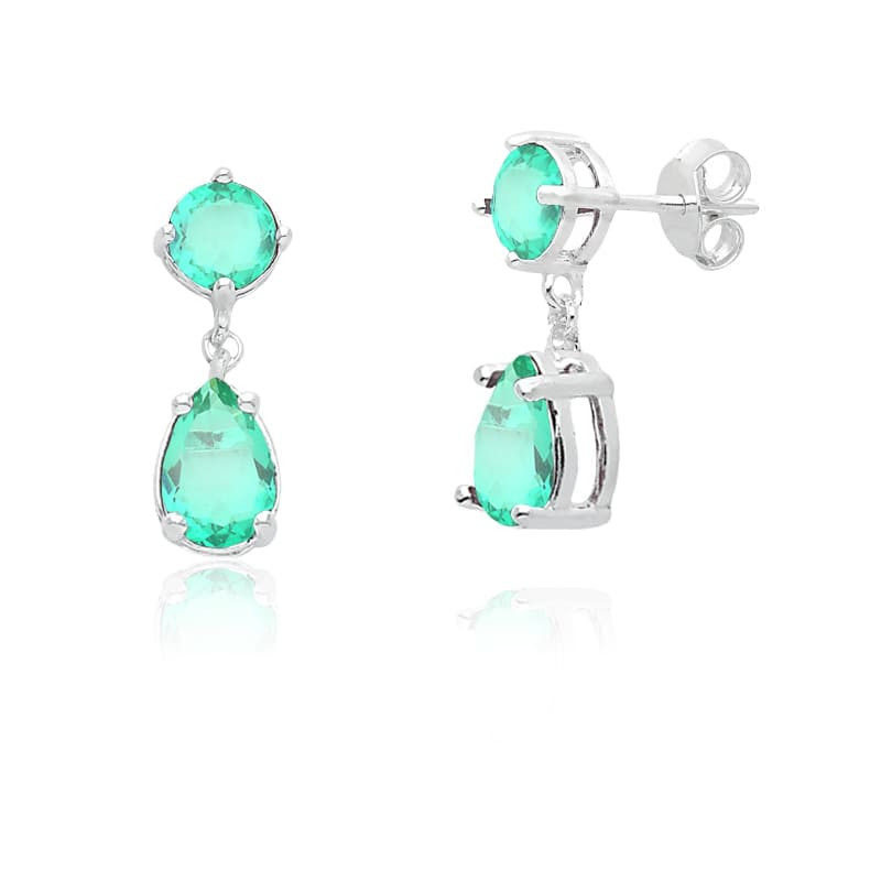 Brinco Galeria 2 Redondo 5mm (3) e Gota 5x7mm Cristal Color - Verde Claro em Prata 925 Legítima