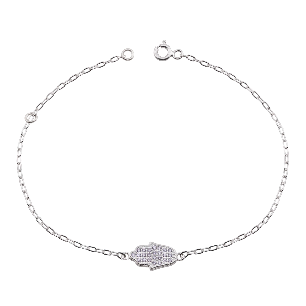 Delicada, simbólica e cheia de significado, a Pulseira Prata com banho de Ródio e pingente Mão de Fátima é a escolha ideal para quem busca proteção com estilo.